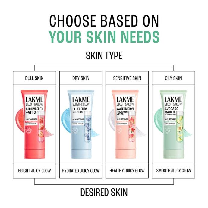 Lakme Blush & Glow Blueberry + Blue Peptide Gentle Jelly Facewash is the ultimate solution for achieving hydrated, glowing skin. Enriched with Blueberry extracts and Blue Peptide, this face wash effectively cleanses while nourishing your skin. Designed for both men and women, it works as a perfect cleanser for dry and dehydrated skin, delivering a juicy glow with every wash.This lightweight jelly formula glides effortlessly, removing dirt, oil, and impurities without stripping your skin of moisture. Infused with Blueberry antioxidants, it enhances hydration and leaves your skin feeling soft, supple, and refreshed. The clinically proven Blue Peptide strengthens your skin barrier by 50%, while boosting hydration levels by 55%, ensuring long-lasting moisture and protection.If you're searching for a simple face wash for oily skin or dry skin, this product is a versatile choice. It caters to various skin needs, making it suitable as a face wash for oily and acne-prone skin or as a gentle face wash for dry skin women. With its barrier-boosting actives, it helps repair and reinforce your skin's natural protective barrier, leaving you with a more even-toned and radiant complexion.Lakme Blush & Glow Blueberry + Blue Peptide Facewash is your go-to for a must-have cleanser that delivers visible results. Whether you're looking for a face wash for men or women, this product ensures your skin stays hydrated, glowing, and healthy. Choose Lakme for the best face wash for glowing skin today!